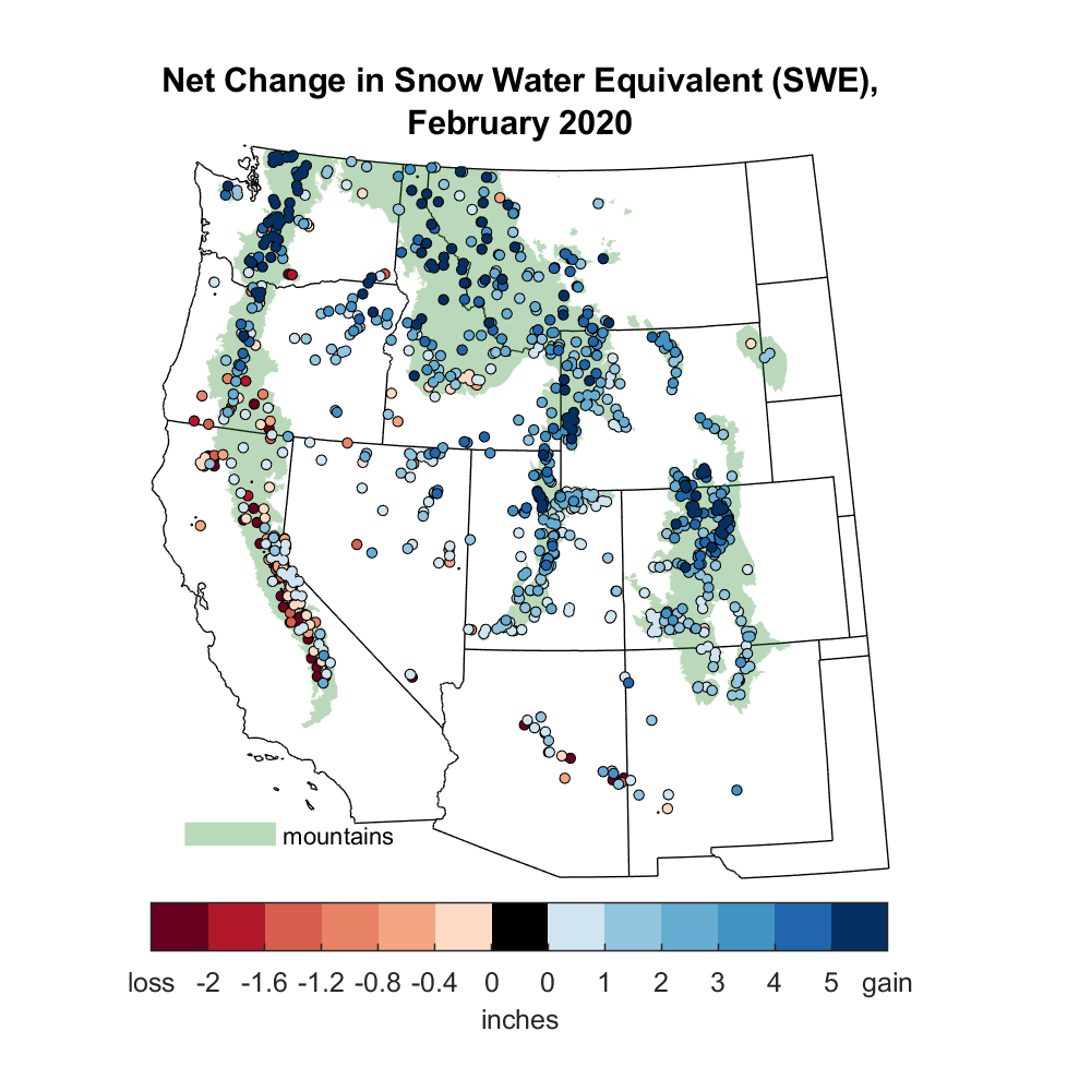 The winter snowpack continued to build in many areas with SWE in February increasing over 5 inches at many stations (Figure 5). The Pacific Northwest, northern Colorado and Utah, western Wyoming, and the Idaho-Montana border had several stations with large increases in SWE. Lower elevation stations in California had a loss of SWE as much as 2 inches, because of the combination of melt and little new accumulation. Higher elevation stations in California gained only an inch of water.