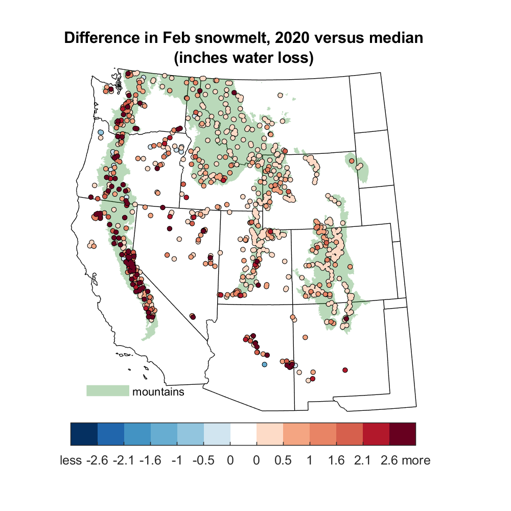Figure 7. This map compares total snowmelt (inches of water) in February 2020 versus the average. Warmer color dots indicate more snowmelt in February 2020 than in an average February, and cooler colors indicate less snowmelt in February 2020 than in an average February. Here snowmelt is defined as reductions in measured Snow Water Equivalent (SWE), so other losses—such as evaporation—are included in the total snowmelt. The green shading delineates mountainous areas as represented in Environmental Protection Agency (EPA) data. — Credit: M. Raleigh, National Snow and Ice Data Center