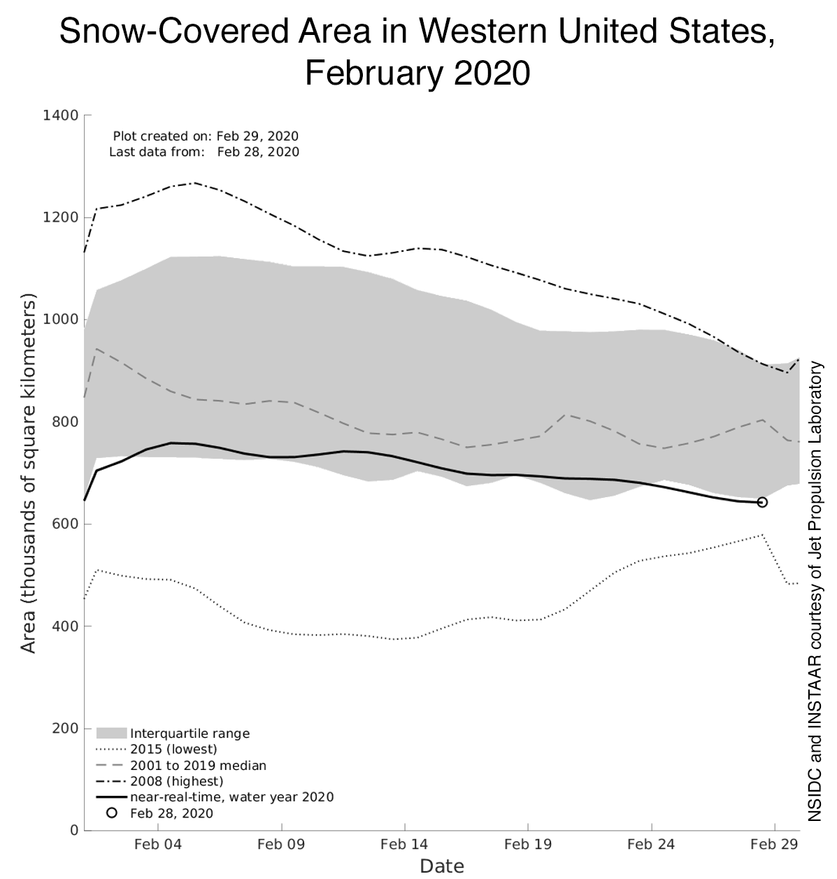 Figure 1a. The solid black line represents the total snow-covered area across the Western United States during February 2020, with February 28 circled at the end. The grey area shows the interquartile range where 50 percent of the historical snow-covered area from 2001 to present falls. The dashed line in the middle of the gray area shows the historical median. The dotted line at the bottom depicts 2015, the lowest year for snow-covered area; the dotted line at the top depicts 2008, the highest year for snow-covered area. — Credit: K. Rittger, Institute of Arctic and Alpine Research (INSTAAR)