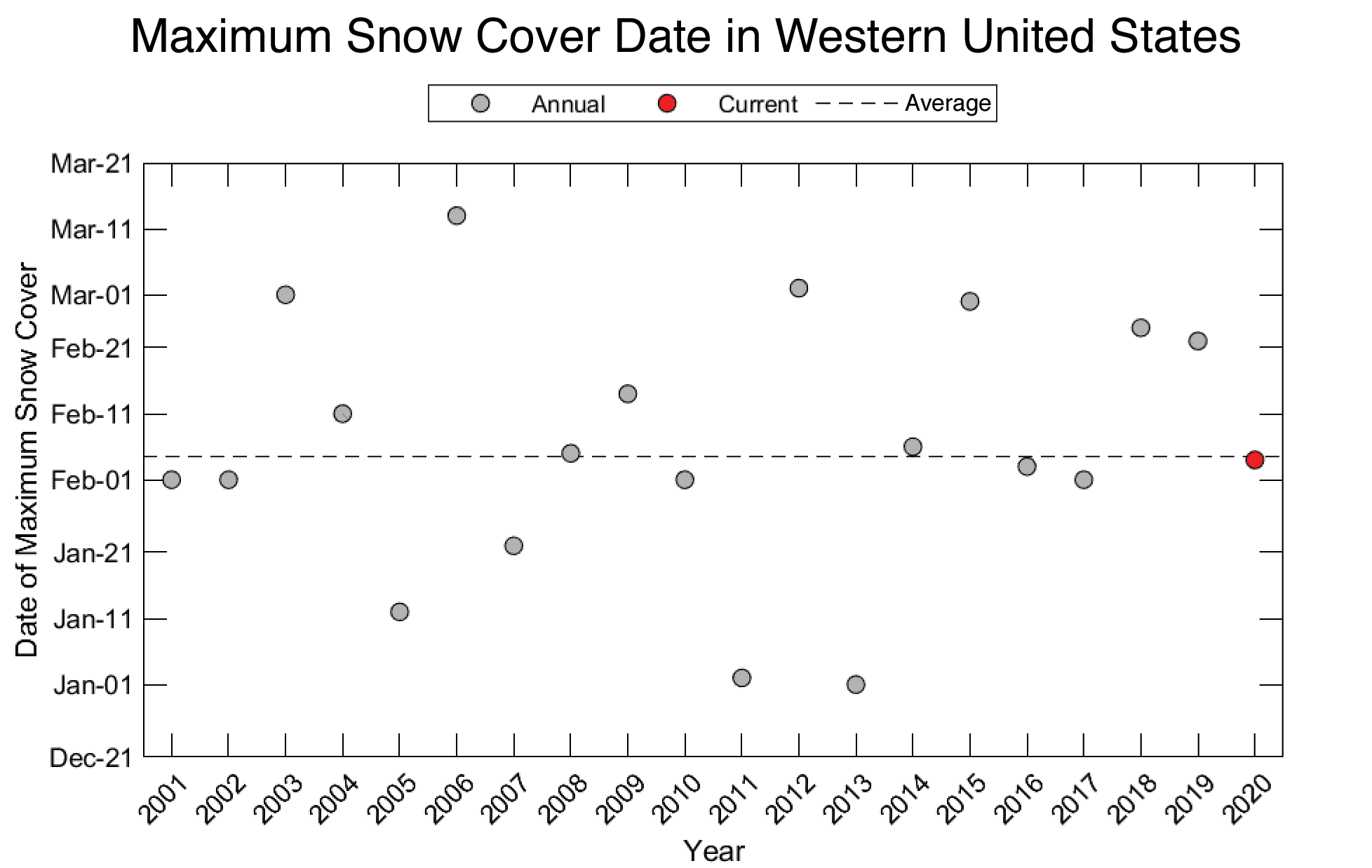 Figure 2. This graph shows the date of maximum snow cover over the Western United States for the 20-year satellite record. The dashed line indicates the average date for the maximum. The red dot shows the maximum snow cover date for the 2019 to 2020 snow cover year. — Credit: K. Rittger, Institute of Arctic and Alpine Research (INSTAAR) & M. Raleigh, National Snow and Ice Data Center (NSIDC)
