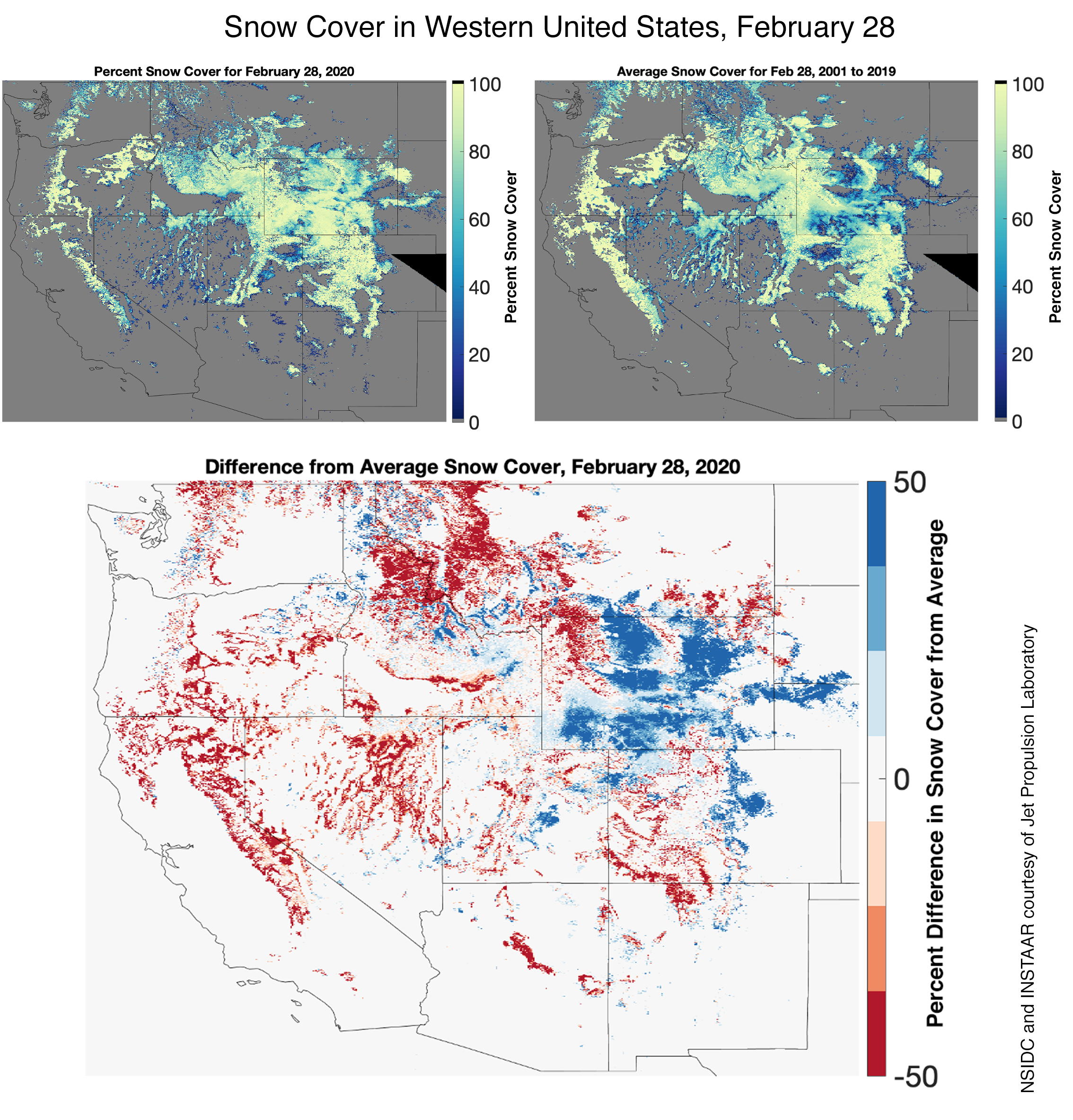 Figure 3. These maps show snow conditions for February 28 across the Western United States. The upper left map shows the percent of snow cover for February 28, 2020. The upper right map shows the average percent of snow cover for February 28 over the 2001 to 2019 record. The bottom map shows the difference between 2020 and the 2001 to 2019 average. The darker the blue the more snow cover in 2020 than the 2001 to 2019 record; the darker the red the less snow cover in 2020 than the 2001 to 2019 record. — Credit: K. Rittger, Institute of Arctic and Alpine Research (INSTAAR)