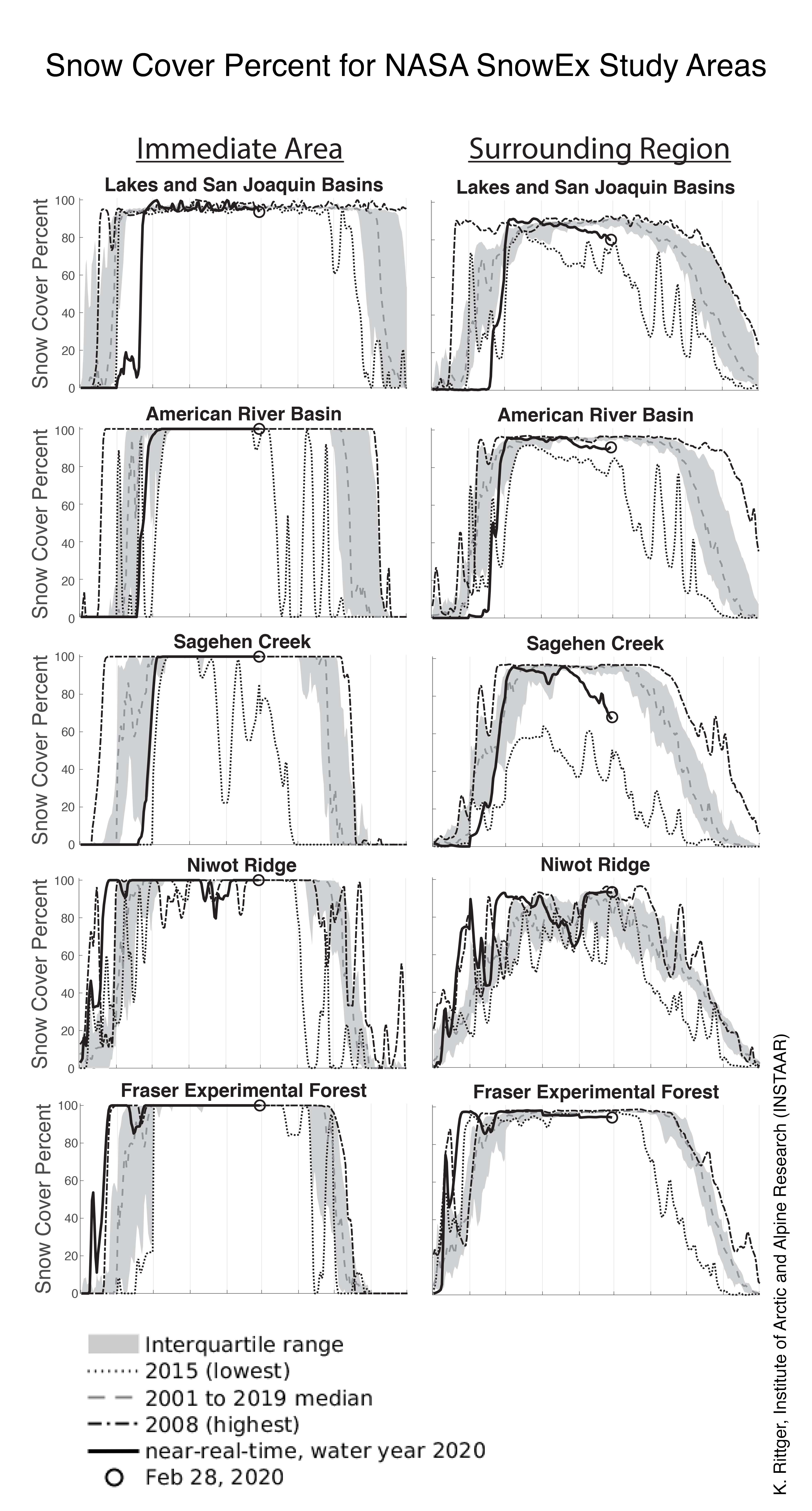 Figure 8: These graphs show snow cover as a percentage around the immediate area (left column) and surrounding area (right column) for five NASA SnowEx study sites. In the left column, the solid black line represents the total snow-covered area in 2 square kilometers (.77 square mile) regions corresponding to the center of each site. In the right column, the solid black line represents the total snow-covered area in a 360 square kilometers (139 square miles) region around each site. The grey area shows the interquartile range where 50 percent of the historical snow-covered area from 2001 to present falls. The dashed line in the middle of the gray area shows the historical median. The dotted line at the bottom depicts 2015, the year of the lowest snow-covered area; the dotted line at the top depicts 2008, the year with the highest snow-covered area. The variability between years is much greater for the surrounding region than the immediate area around each SnowEx study site. — Credit: K. Rittger, Institute of Arctic and Alpine Research (INSTAAR)