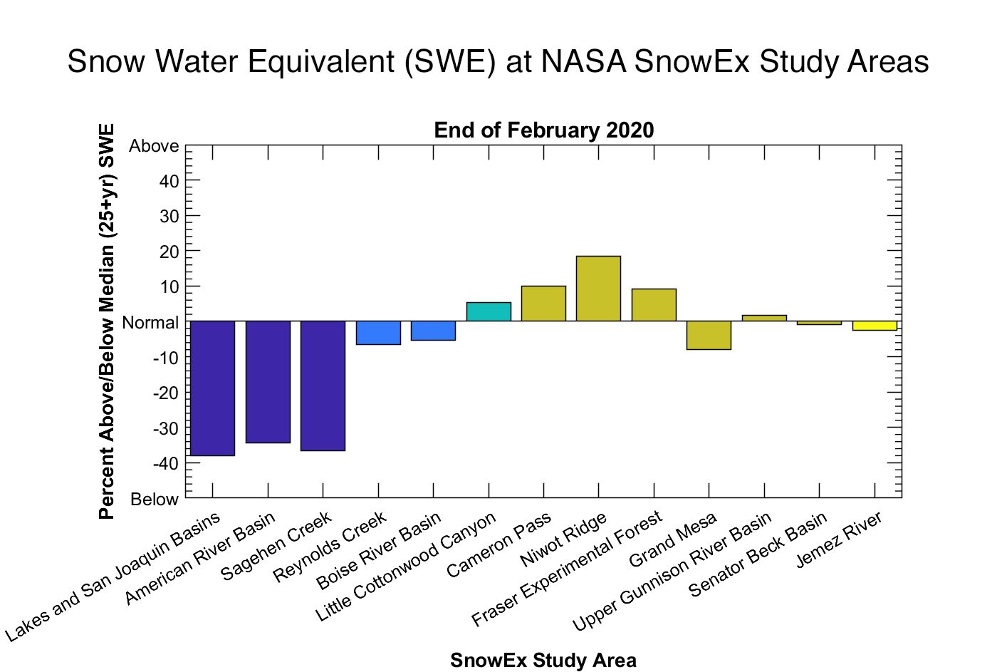 Figure 9a. This chart shows Snow Water Equivalent (SWE) conditions at thirteen NASA SnowEx study areas at the end of February 2020. SWE is expressed as percent of the long-term average value at nearby snow pillow sites from the full National Resources Conservation Service (NRCS) Snow Telemeter (SNOTEL) and California Department of Water Resources (DWR) snow pillow networks, weighted by proximity to each study area. Common colors denote different states, from left to right California, Idaho, Utah, Colorado, and New Mexico. — Credit: M. Raleigh, National Snow and Ice Data Center (NSIDC)