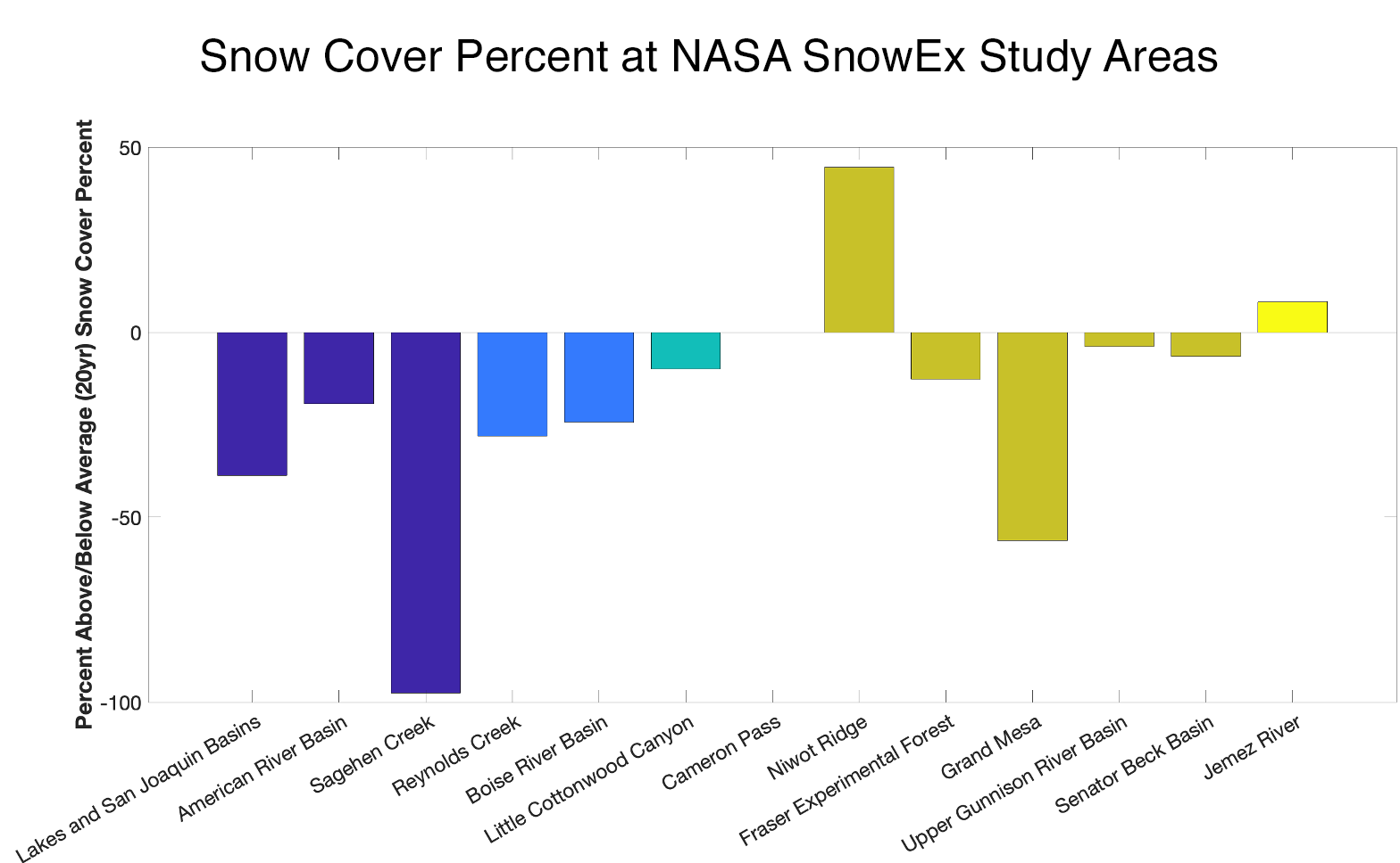Figure 9b. This chart shows snow cover conditions in 360 square kilometer regions around NASA SnowEx study sites at the end of February 2020. Snow cover is expressed as a percent of the long-term average value from the 20-year satellite record. — Credit: K. Rittger, Institute of Arctic and Alpine Research (INSTAAR) & M. Raleigh, National Snow and Ice Data Center (NSIDC)