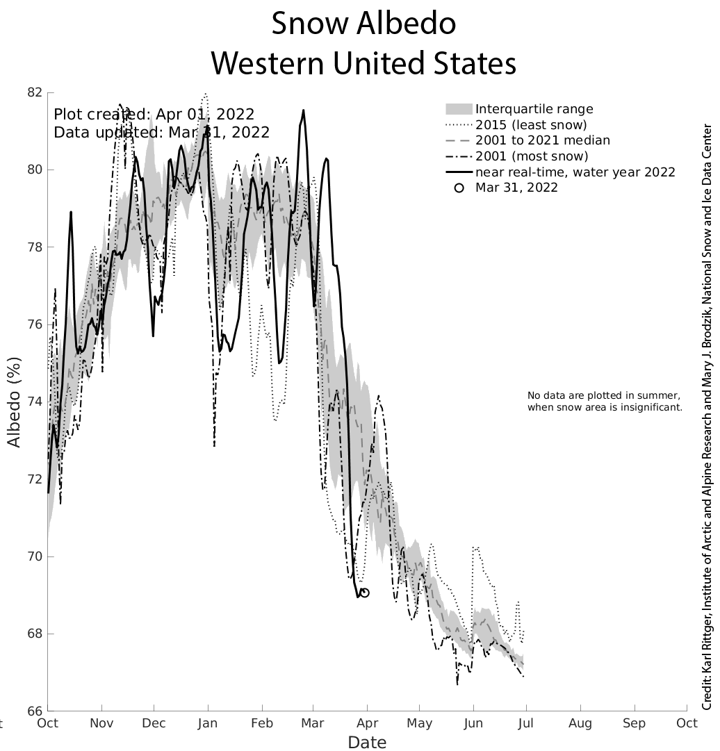 - In early March, snow reflectivity, known as snow albedo, was high with winter-like conditions. From mid- to late-March, snow albedo decreased rapidly, thus increasing snowmelt, exposing light-absorbing particles, and further decreasing snow albedo.