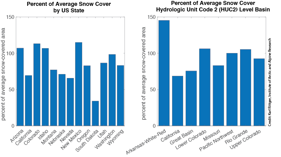 - Snow-covered area for the western United States was 97 percent of average for March but varied regionally with above-average area in central continental regions and below-average area in coastal and northern regions.