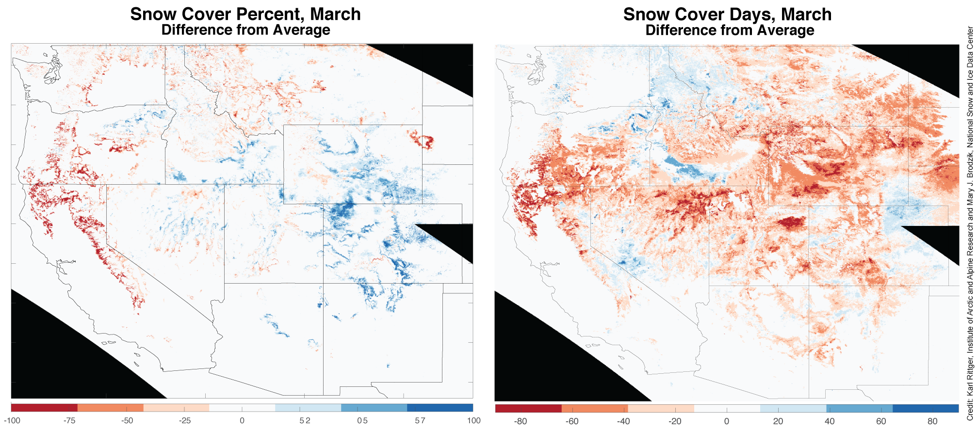 - Snow cover days remained well below average across the western United States except for a few regions like Washington and northern Idaho.