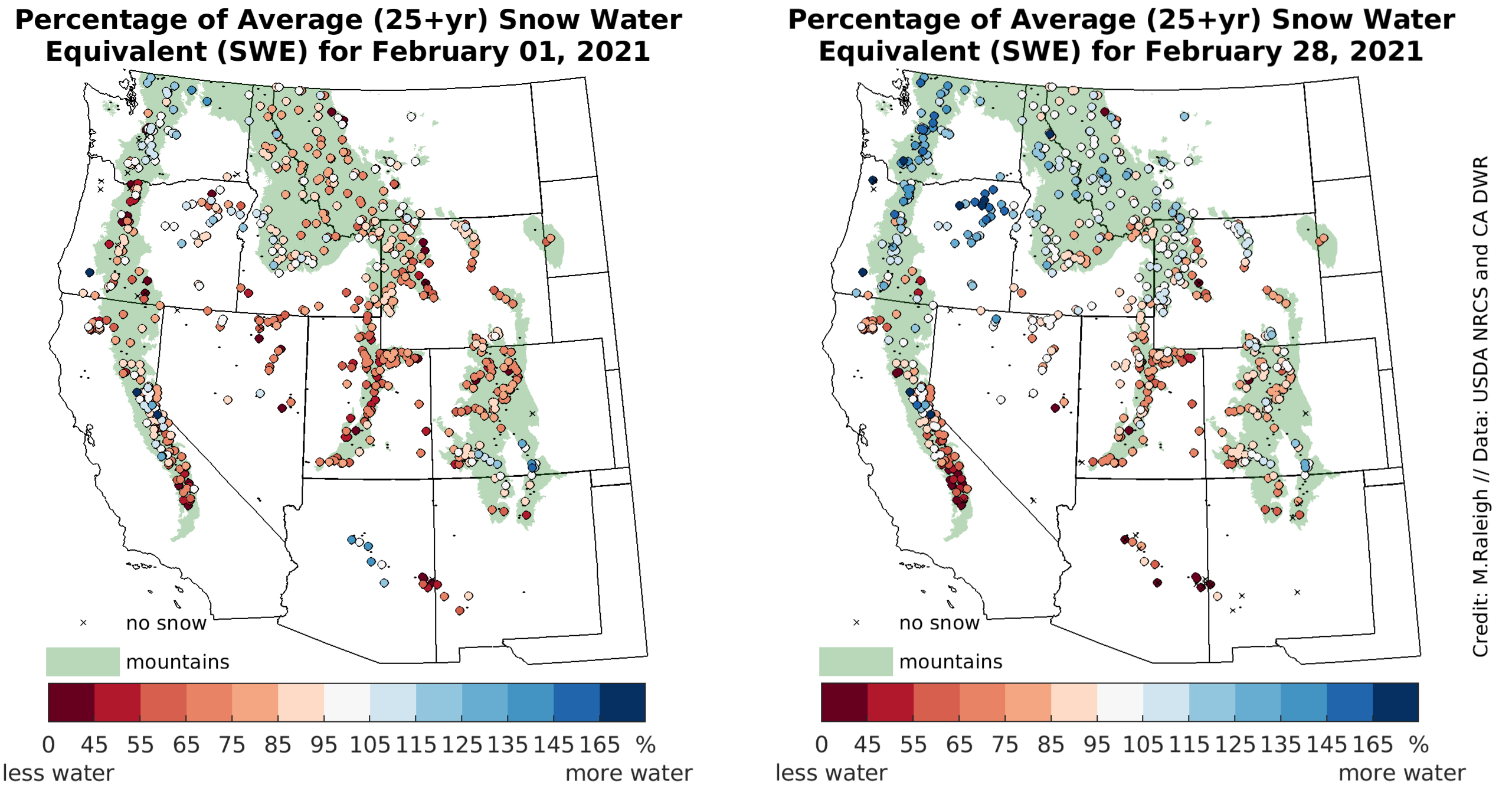 Figure 5. The left map shows snow water equivalent (SWE) at monitoring sites at the start of February 2021 and the right map shows SWE at the end of February 2021. SWE is expressed as percent of average conditions at each site, with warmer colors indicating below average SWE, or less water in the form of snow, cooler colors indicating above average SWE, or more water, and white areas indicating average SWE. The green shading delineates mountainous areas as represented in Environmental Protection Agency (EPA) data. — Credit: M. Raleigh