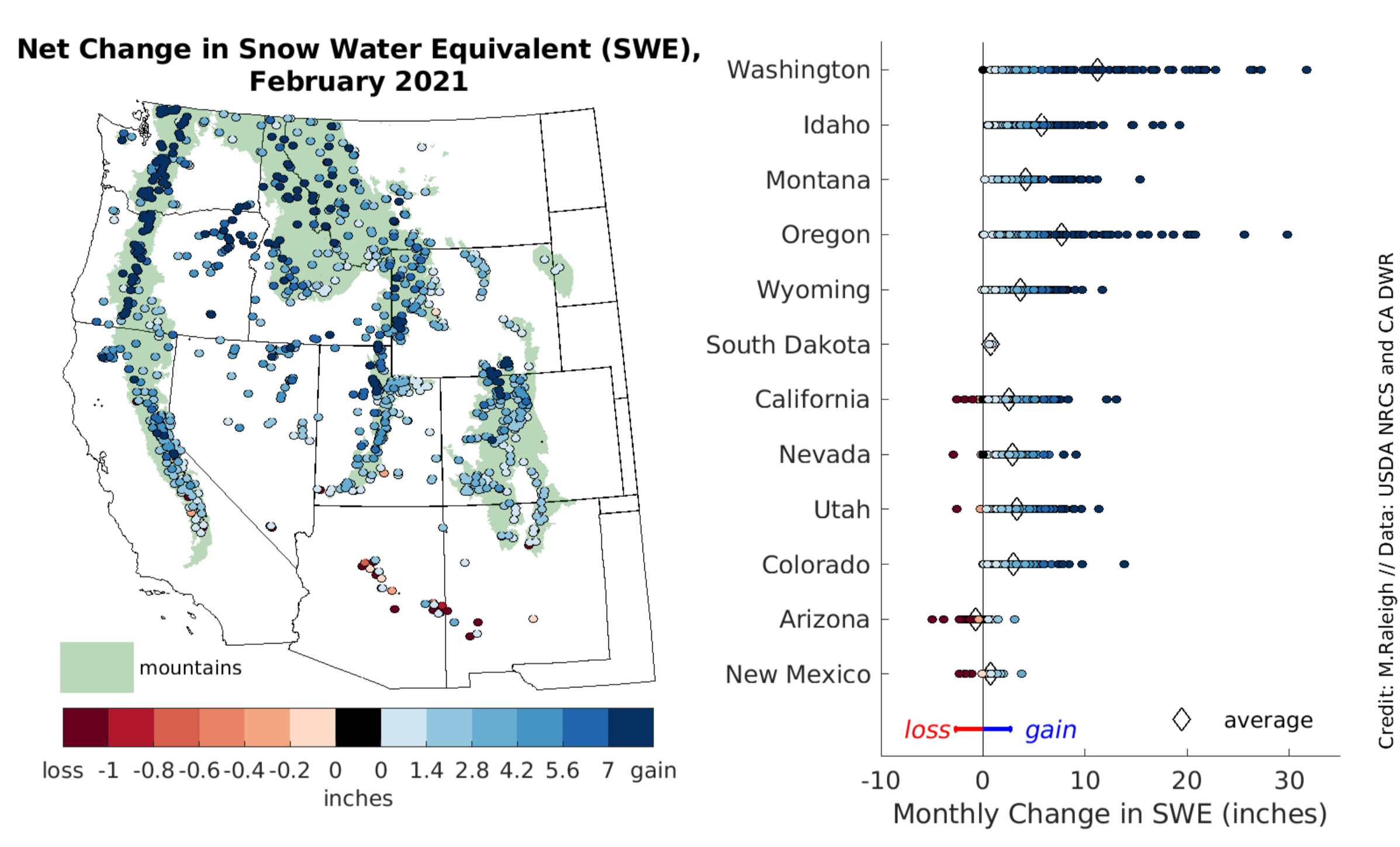 Figure 6. The left map shows the net change in snow water equivalent (SWE) in inches during February 2021, with blue indicating a net gain (more snowfall than snowmelt) and red indicating a net loss (more snowmelt than snowfall). Note that the color bars at the bottom are not linear and have different increments across the warm and cool colors to best visually represent the values in the map. The green shading delineates mountainous areas as represented in Environmental Protection Agency (EPA) data. The right chart shows the monthly change in SWE at the stations in each state (circles), with the state average shown (diamond). Note that stations are not necessarily indicative of the true state average because they are not distributed evenly in space and elevation. — Credit: M. Raleigh