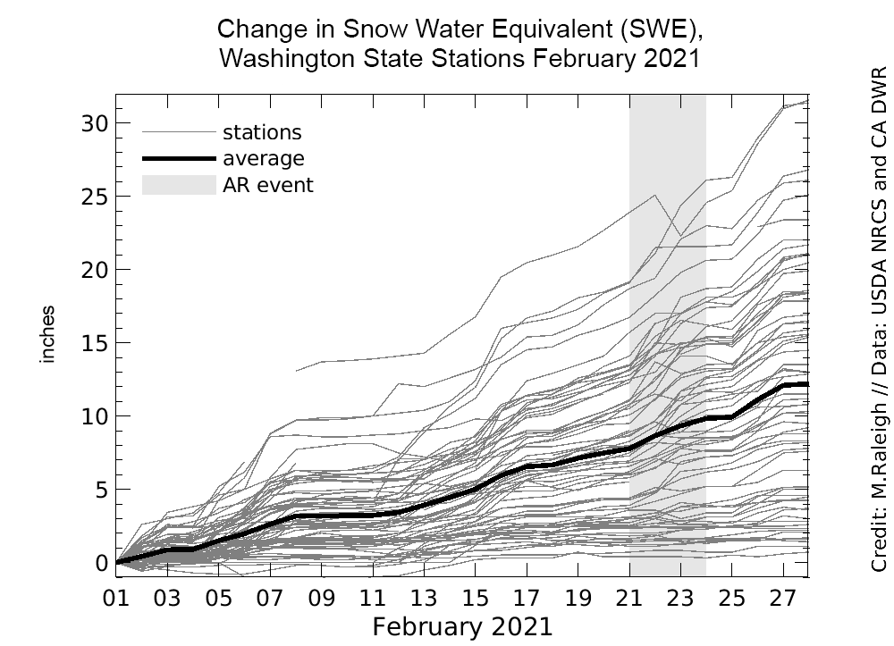 While the deep dive of the polar vortex brought a week of cold weather, snow, and severe impacts to the central United States, Texas, and northern Mexico in mid-February, the US Pacific Northwest was quietly having a rather snowy February. Our SWE analyses from December and January showed Washington as a stand-out with much higher-than-average SWE, relative to other western states. February was no exception, as there were only a handful of days when there was no new SWE recorded at any snow stations in Washington (Figure 7). Across the Washington network, there was a remarkably steady increase in SWE, with about 31 centimeters (12 inches) of SWE on average delivered over the month, with no clear dominant event delivering the bulk of that new snow.