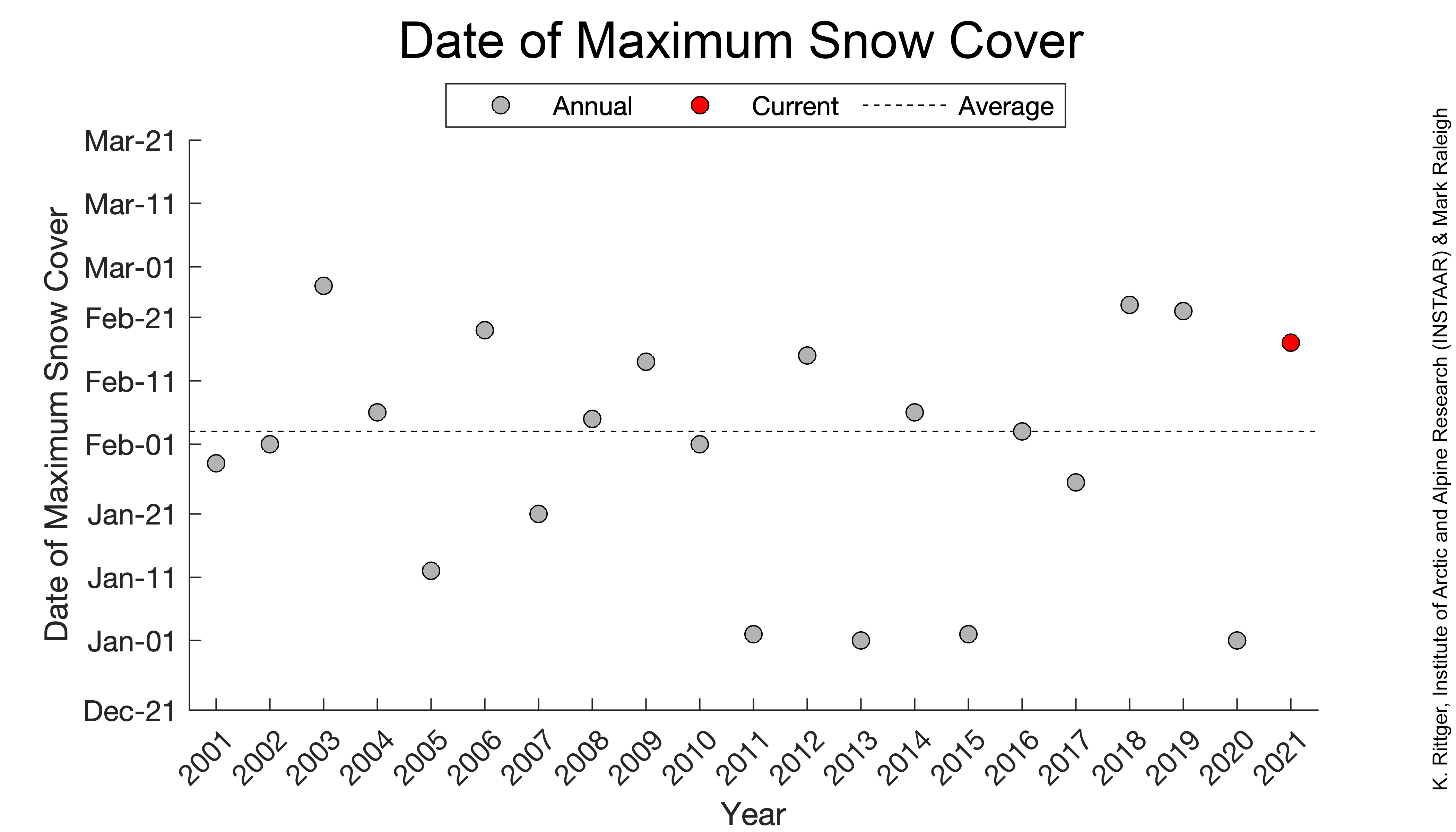 Figure 1. This graph shows the date of maximum snow cover over the western United States for the 21-year-satellite record. The dashed line indicates the average date for the maximum. The red dot shows the maximum snow cover for the 2020-2021 snow cover year. — Credit: K. Rittger, Institute of Arctic and Alpine Research (INSTAAR) & Mark Raleigh