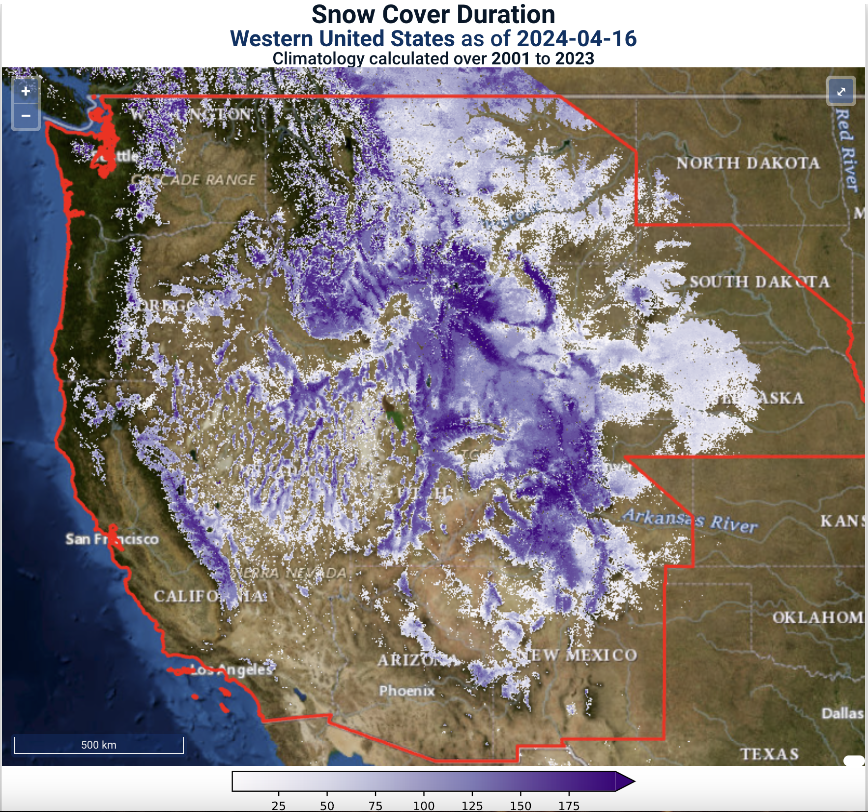 Snow-covered area in April 2024 across the western United States was 203 percent above average, more than double for this time of year (Table 1). Although the 500,000 square kilometers (193,000 square miles) of snow cover for April 2024 was still below last year’s record setting snow cover, this year ranked as the second highest April over the 24-year satellite record. There was nearly four times more snow cover in April 2024 than April 2015, the lowest year on record.