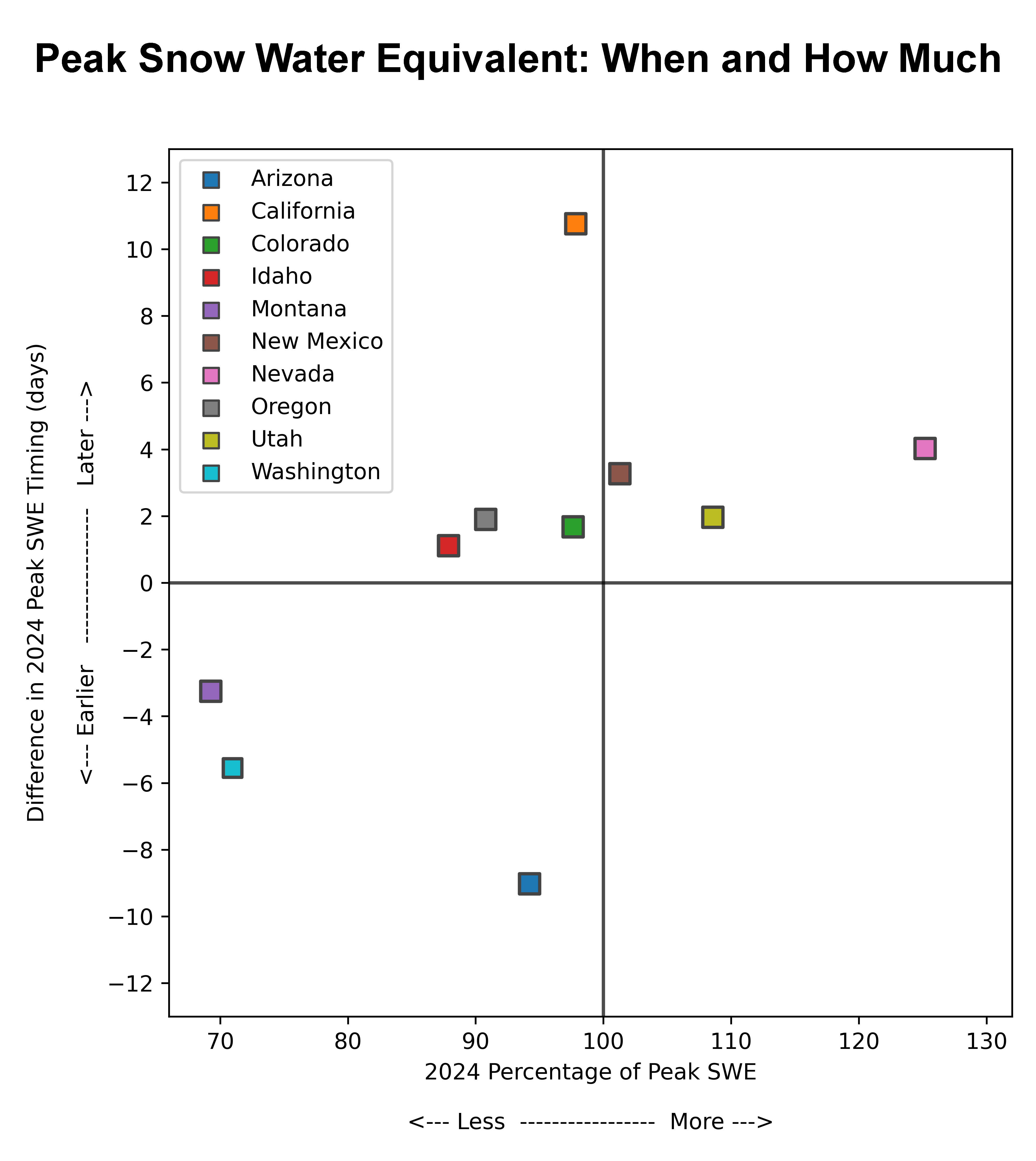 Although many stations reported well below their average peak SWE at the end of March, the timing of peak SWE varies across the western United States. SWE values can be examined further to assess when peak SWE occurred and by how much. In Figure 5, states close to the center of the plot were experiencing typical end-of-April conditions for both SWE accumulation and timing. For example, state-wide conditions in Colorado showed peak SWE accumulation at 98 percent of average, with peak SWE happening approximately two days later than average. By contrast, Montana had only 69 percent of average SWE accumulation, which occurred more than three days earlier than average. Washington and Arizona also had these low/early SWE. Nevada had the highest relative peak SWE at 125 percent of average, while California had the largest shift in peak SWE timing at nearly 11 days later than average. As the melt season continues, the timing and amount of peak SWE will interact with temperature and precipitation patterns to determine available water resources for later spring and summer.