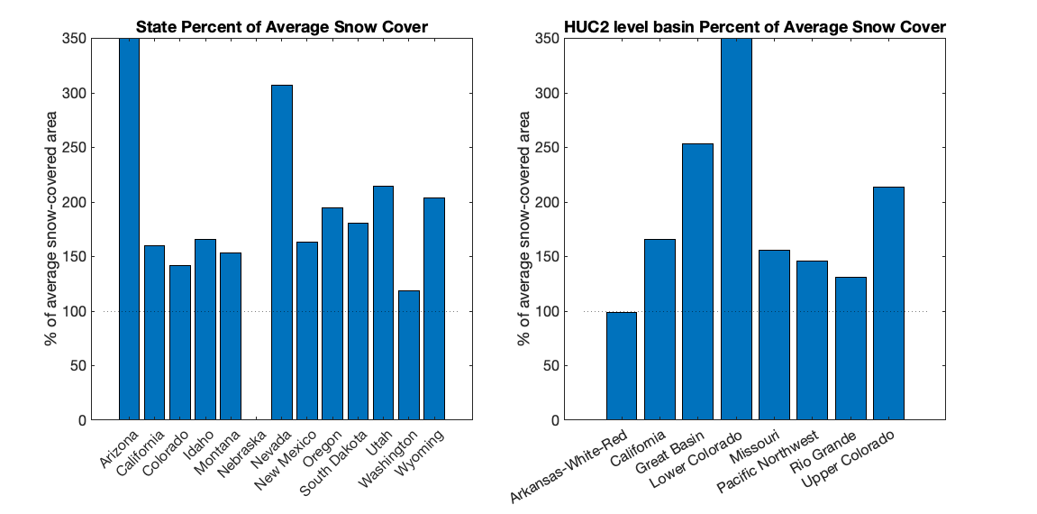 - Snow-covered area for the western United States was 231 percent of average for April, the highest for the second month in a row since the satellite record began in 2001.