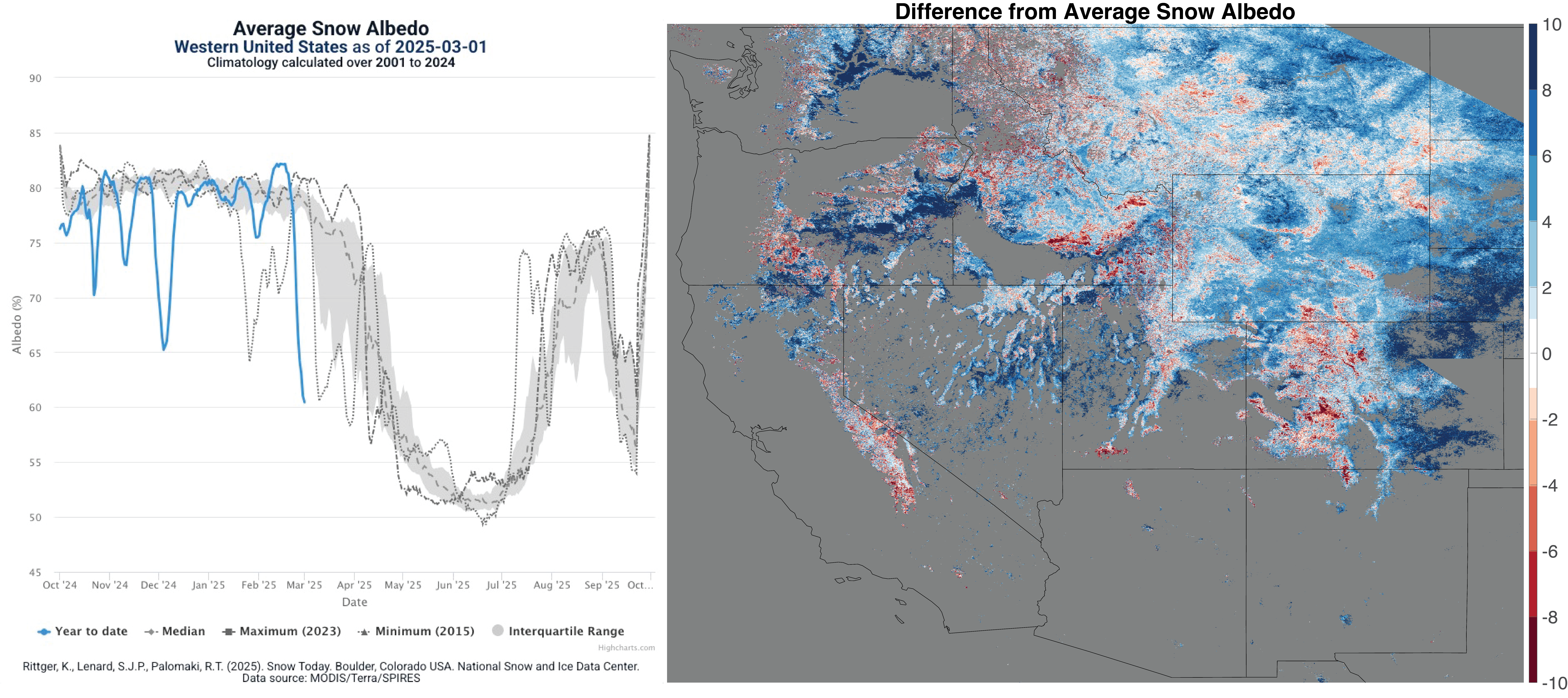 Average snow brightness, known as snow albedo, was five percent below average at the beginning of the month (Figure 4, left). Snowstorms temporarily brightened the snow albedo to above average before rapidly decreasing in late February. There were also a few days when many low elevation areas were blanketed with bright snow that have been historically snow free. This led to vast regions of above average snow on the spatial maps (Figure 4, right). However, this low-elevation snow did not linger long enough to darken. By the end of February, average snow-covered area was just below the twenty-fifth percentile (Figure 3, upper left).