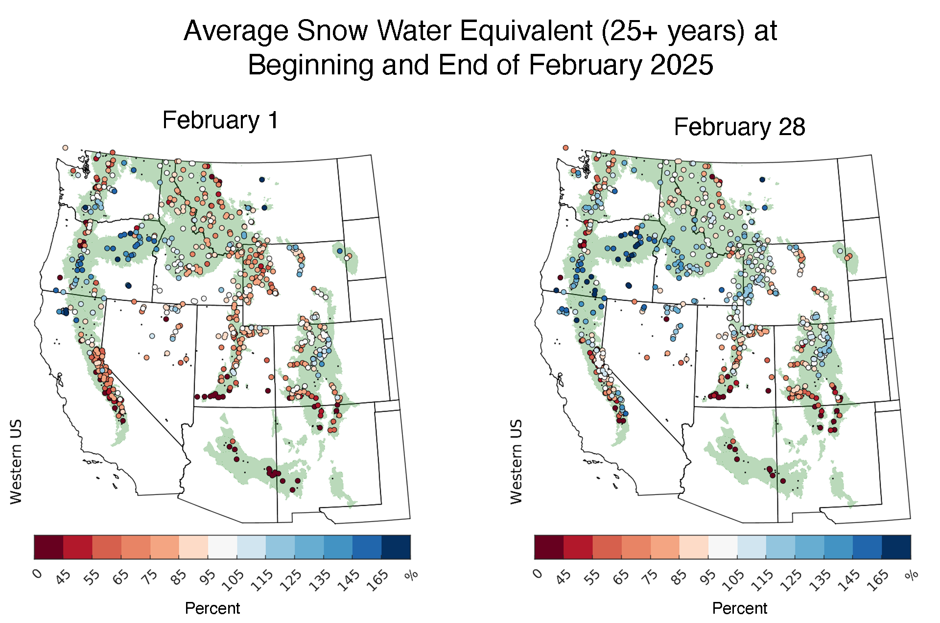- Nearly all SWE stations across the western United States reported gains in February, except for a few low-elevation stations primarily in the deserts of the Southwest.